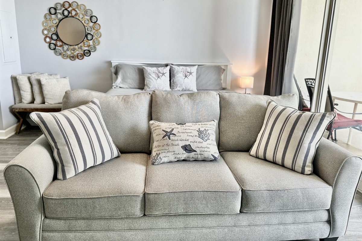 Open Concept Studio: Features a brand-new sleeper sofa with a memory foam mattress, a plush new couch, and a 58” Smart TV for movie nights after a day in the sun.